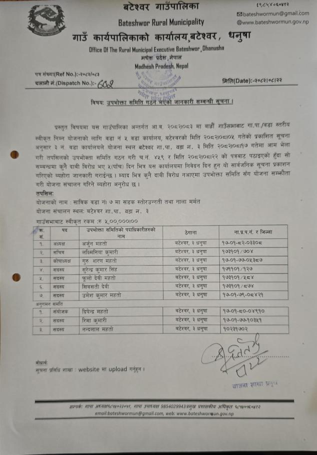 उपभोक्ता समिति गठन भएको जानकारी सम्बन्धी सुचना।