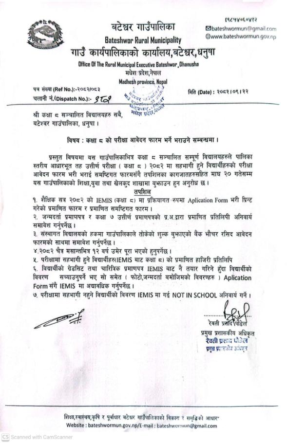 कक्षा ८ को परिक्षा आवेदन फारम भर्ने भराउने सम्बन्धमा।