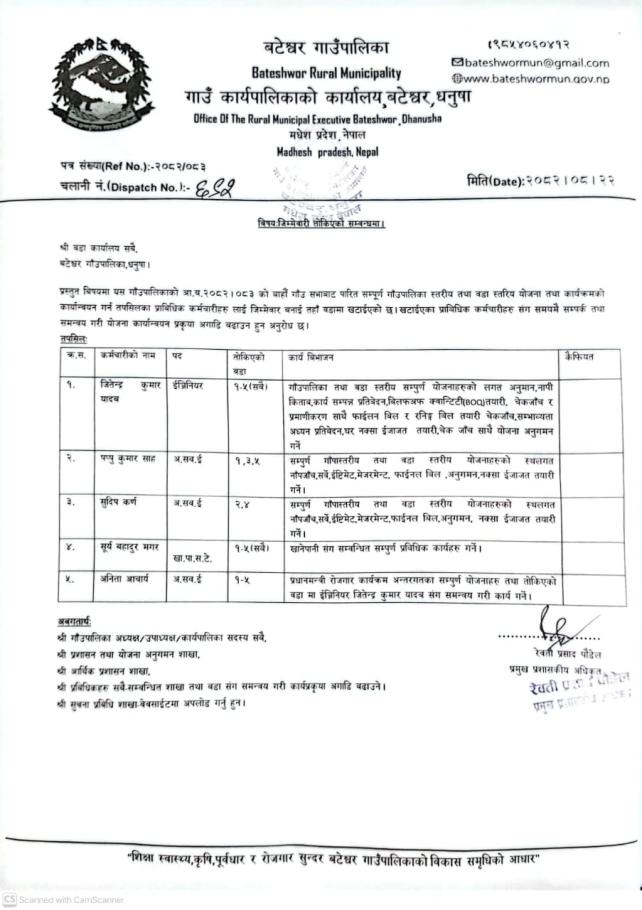 जिम्मेवारी तोकिएको सम्बन्धमा