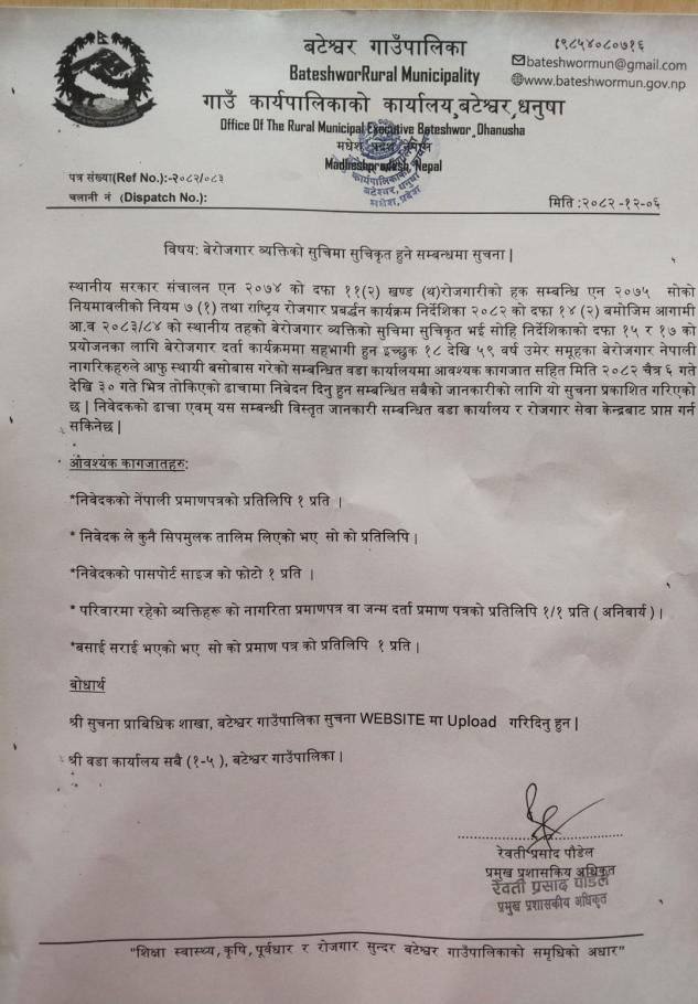 » वेरोजगार व्यक्तीको सुचीमा सुचिकृत हुने सम्बन्धि सुचना।