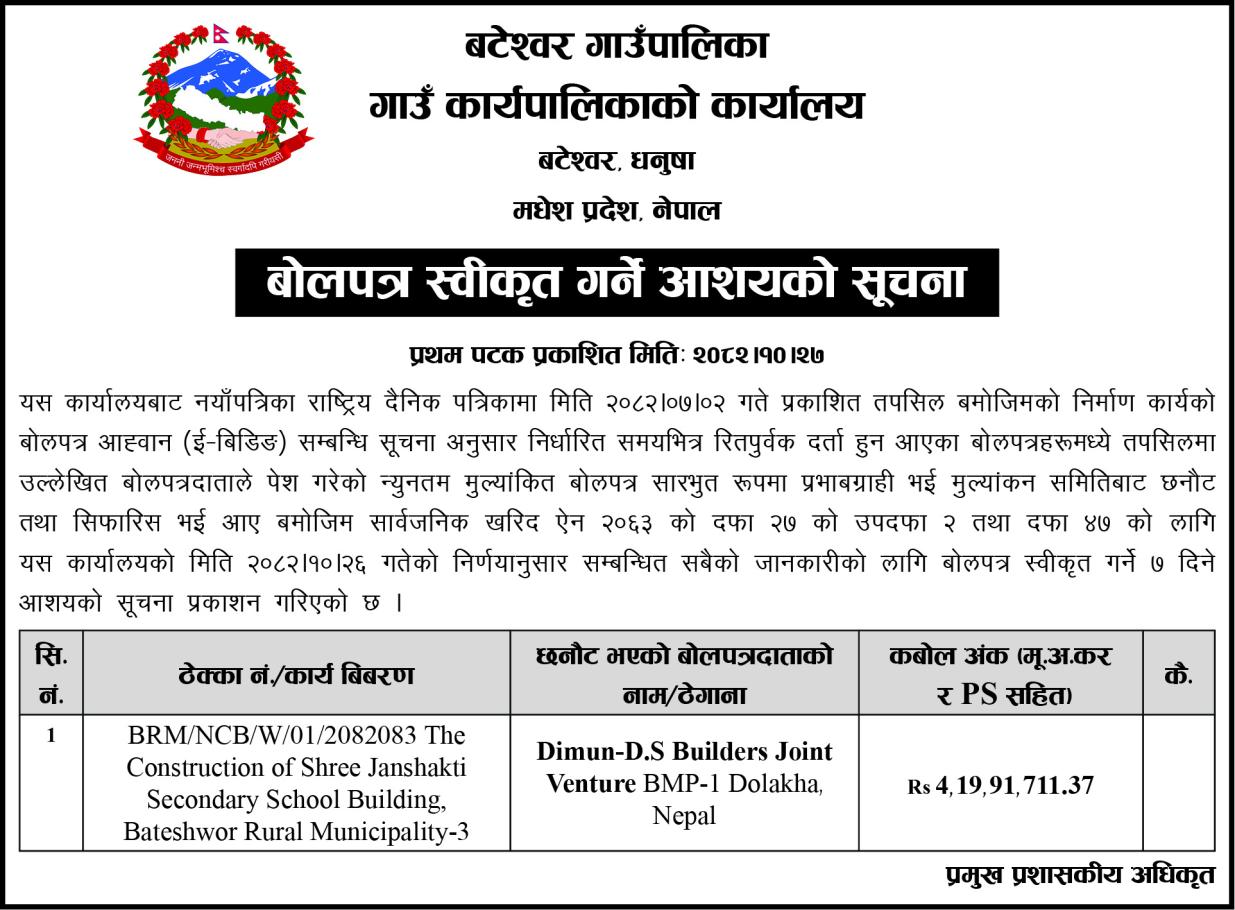» बोलपत्र स्वीकृत गर्ने आशयको सुचना