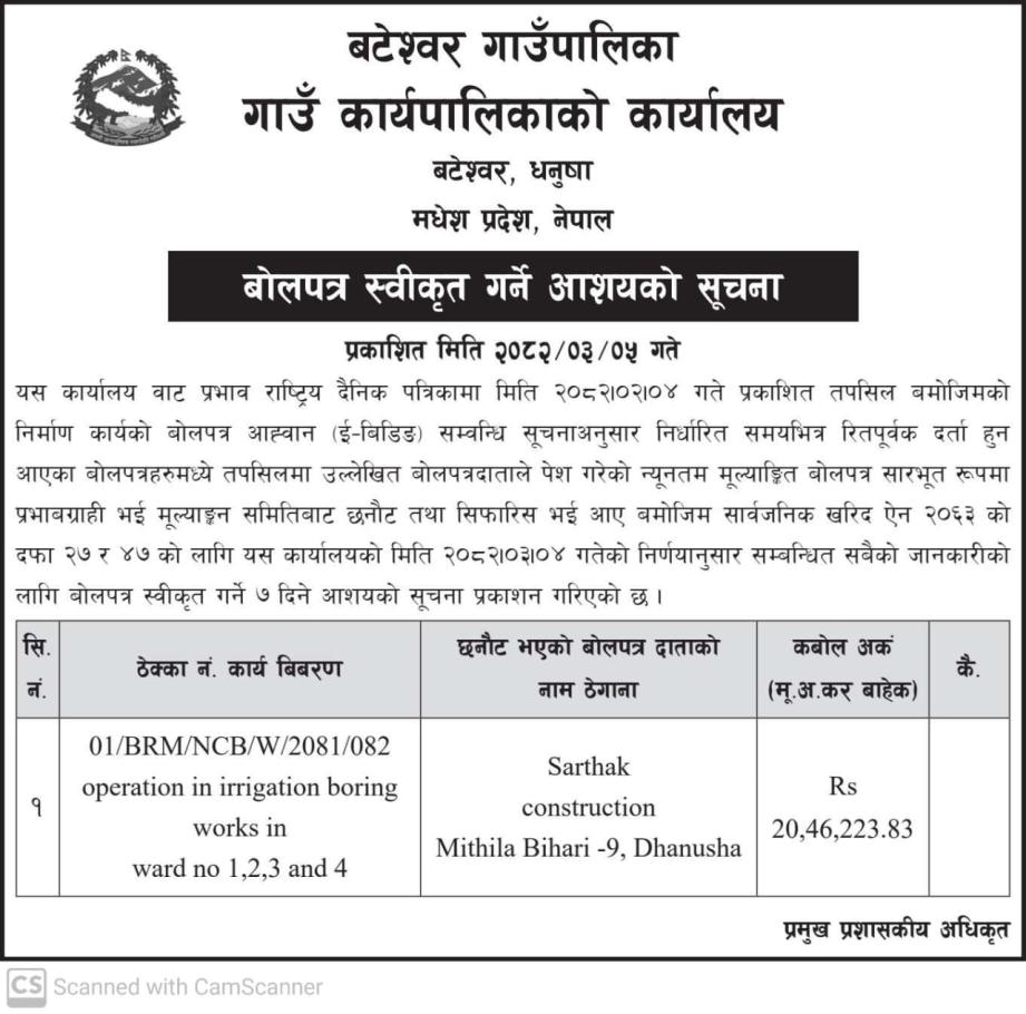 बोल पत्र स्वीकृत गर्ने आशयको सुचना।