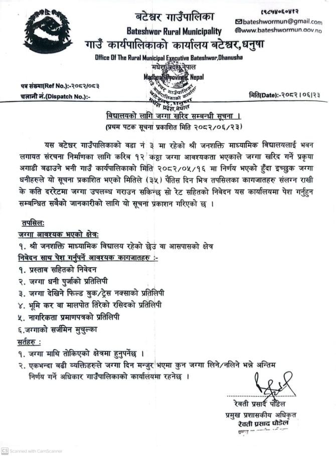 विद्यालयको लागि जग्गा खरिद सम्बन्धि सुचना।